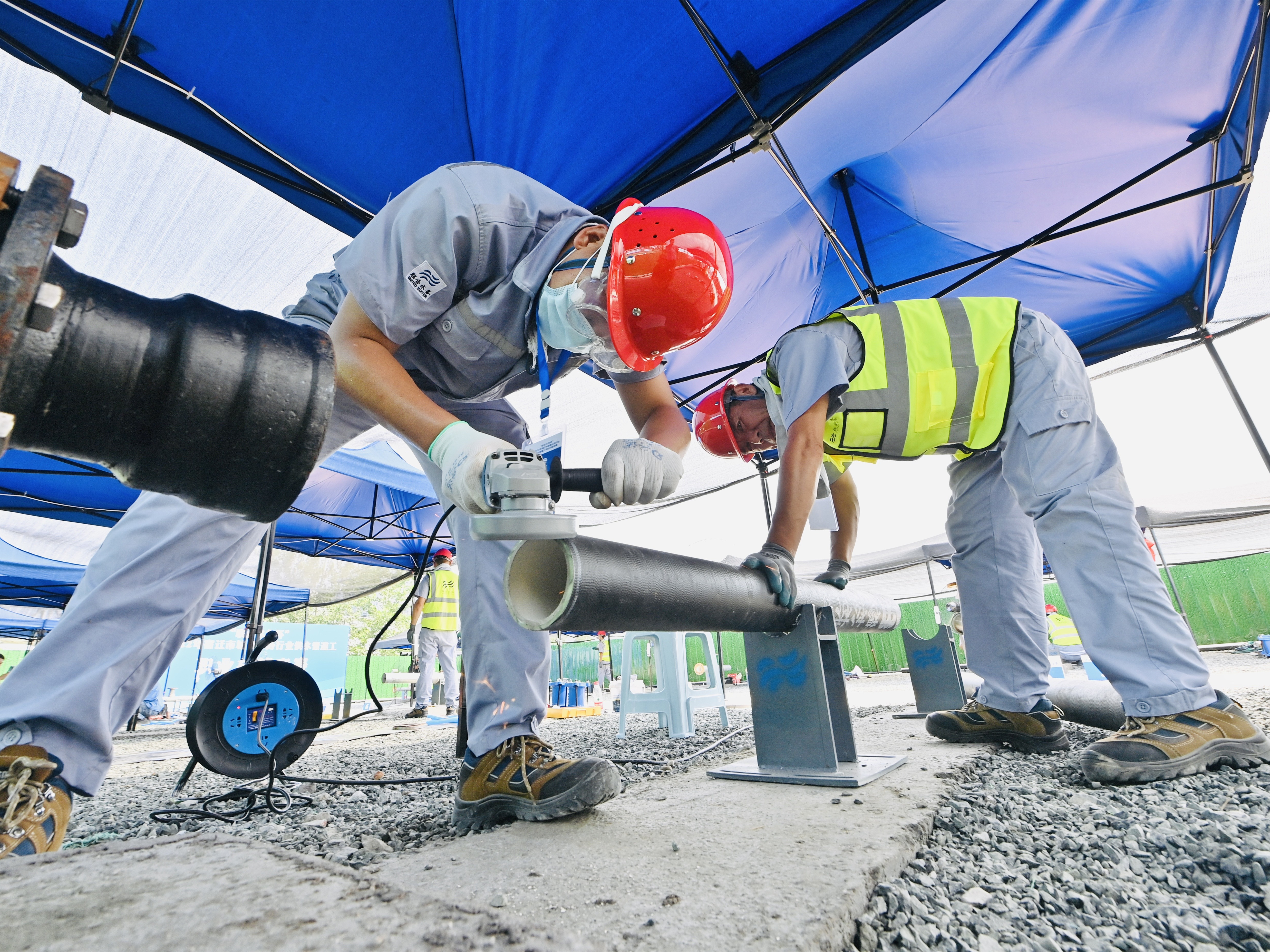 實際操作考核的場地設置在戶外,現場酷熱難耐,打磨聲、切割聲不絕于耳,現場一片忙碌。我公司參賽選手均按照維修要求有條不紊地進行操作,測量、切割、磨光、倒角、拉入……他們認真細致,在規定時間內完美地完成了考試。比賽不僅考驗技術,更考驗耐力和心理抗壓能力,他們執著專注、精益求精的匠人精神讓人深刻印象,他們用自己的汗水和技藝追求屬于聯合水務的“卓越”。有了這次實戰的鍛煉,相信他們在接下來的省級競賽中一定能發揮得更加出色。