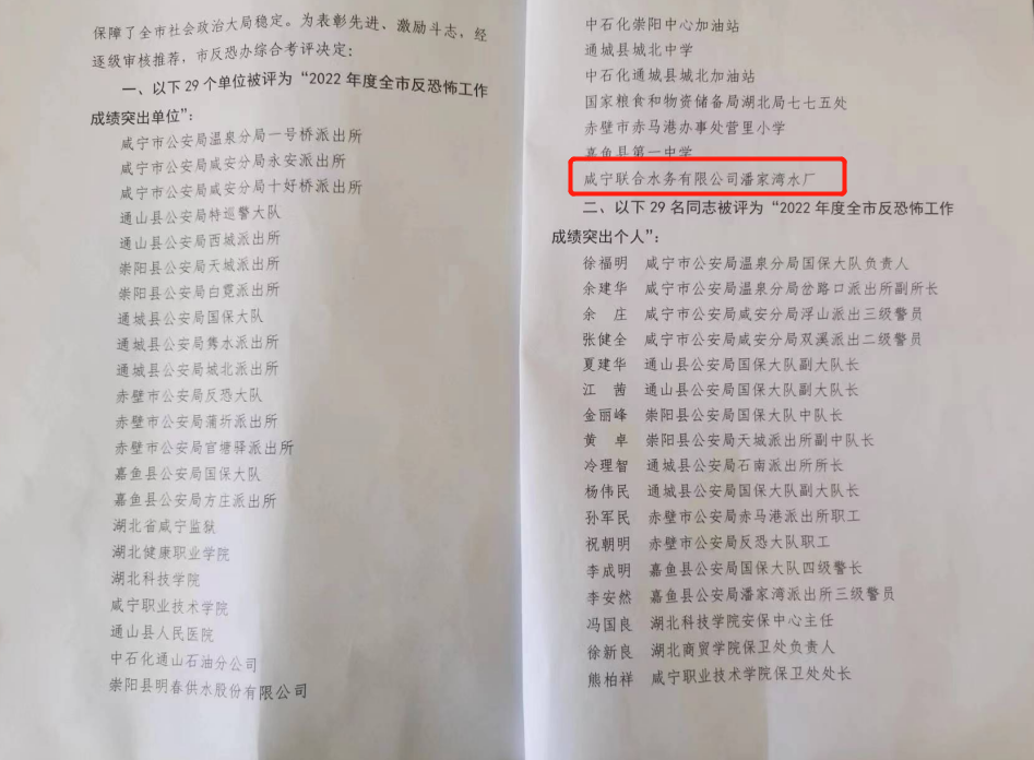 近日,咸寧市反恐怖工作領導小組辦公室發布了《關于表彰2022年度全市反恐怖工作成績突出單位和個人的決定》,咸寧聯合水務有限公司潘灣水廠榮獲“2022年度全市反恐怖工作成績突出單位”稱號。