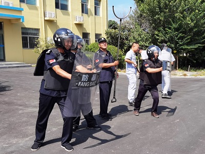 一番短暫練習之后,模擬演練正式開始。本次演練模擬的是1名暴徒持兇器欲強行進入廠區圖謀不軌,安保人員發現后立即上報,并手持鋼叉、防暴盾等工具與“暴徒”展開周旋阻止其進入,公司立即啟動反恐應急預案,第一時間向上級公安機關報警,并迅速組織公司安保人員及在廠員工共同與“可疑人員”抵抗。派出所民警在接到報警后立即出警,和公司人員一起將“可疑人員”控制并帶走。