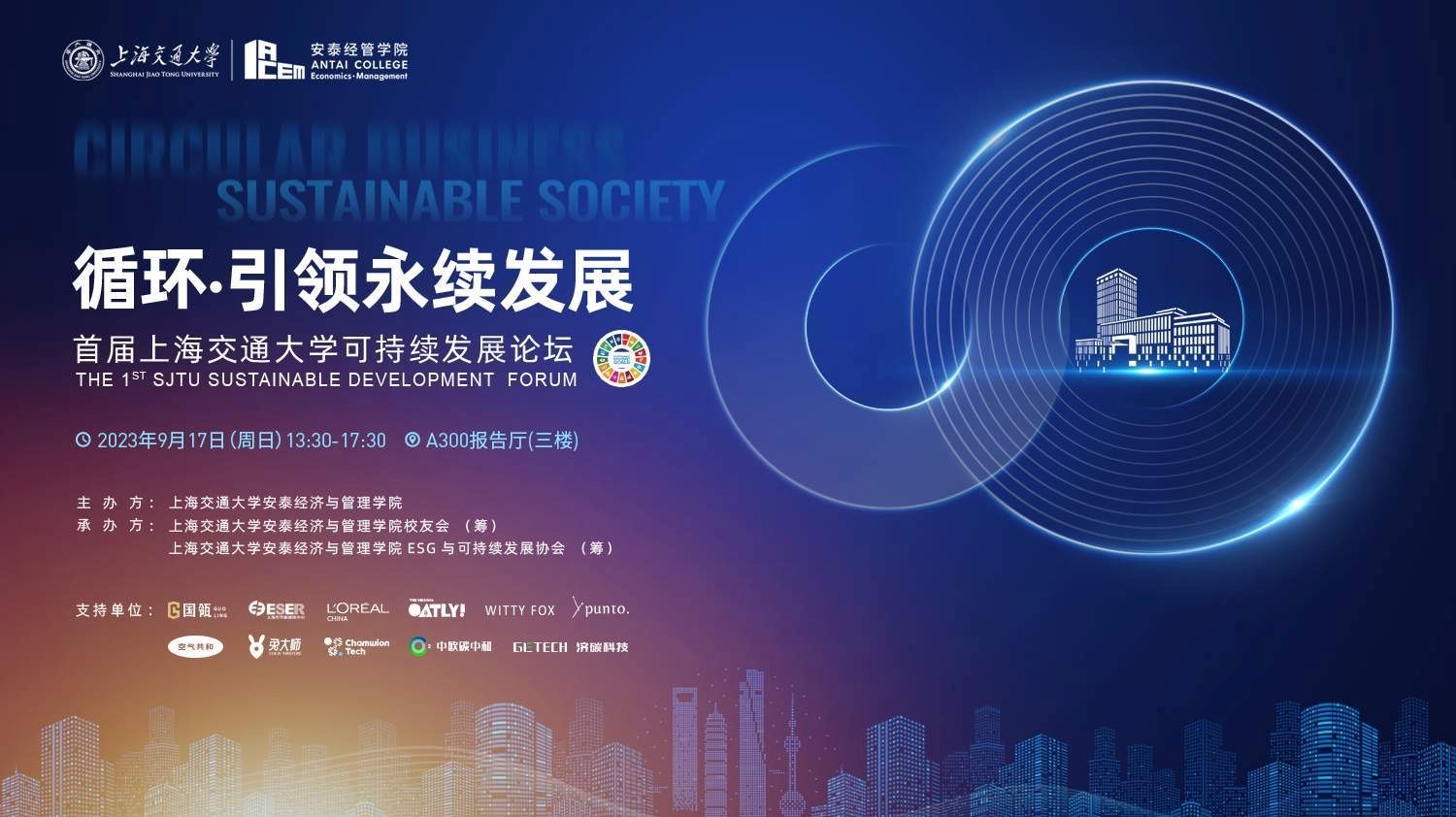 2023年9月17日,由上海交通大學安泰經濟與管理學院主辦的首屆上海交通大學可持續發展論壇在上海交通大學徐匯校區順利舉辦。本屆論壇以“循環·引領永續發展”為主題,吸引了來自可持續發展與ESG相關領域的投資者、實踐者、關注者,以及上海交大校友、在校師生共300余人現場參與本次論壇。