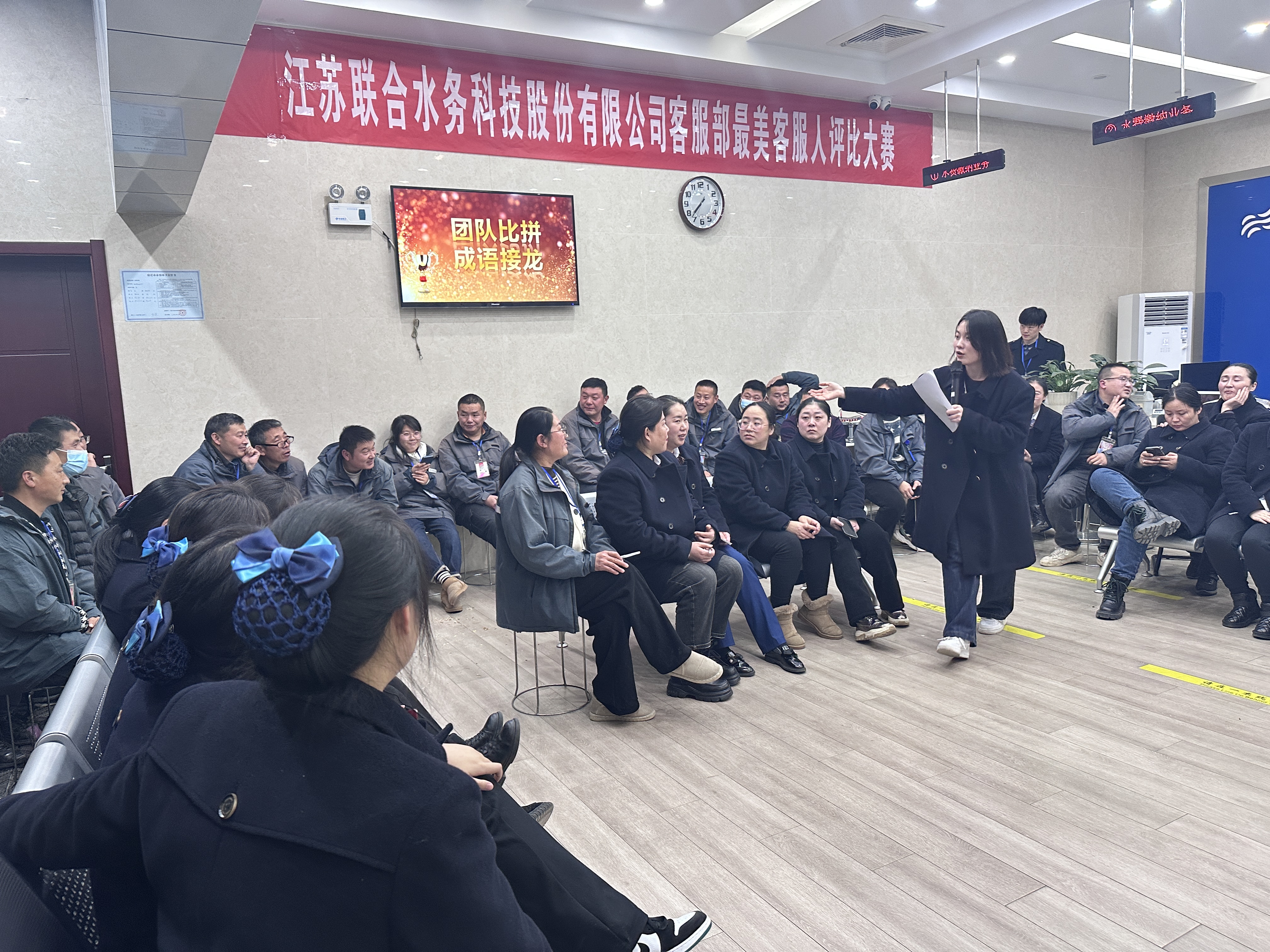 活動開始前,客戶服務部經理陳美菊講話,她肯定了部門在2023年度所取得的成績,也肯定了所有客服人的付出,在對全體客服人表示感謝的同時,希望2024年客服工作能再升級,服務水平再上新臺階。為了摸清大家對工作中所學知識的掌握程度以及處理問題的能力,現場設置了知識競答環節,內容緊緊圍繞供水與服務的相關知識,讓大家在輕松歡快的氛圍中能收獲更多知識。隨后大家以小組賽的形式進行了成語接龍游戲,通過游戲增進大家的集體榮譽感以及團隊合作精神。今年新增了投票環節,現場讓所有人員寫下心目中優秀的客服人及抄收員,并進行無記名投票與現場唱票,全程透明公正公開。