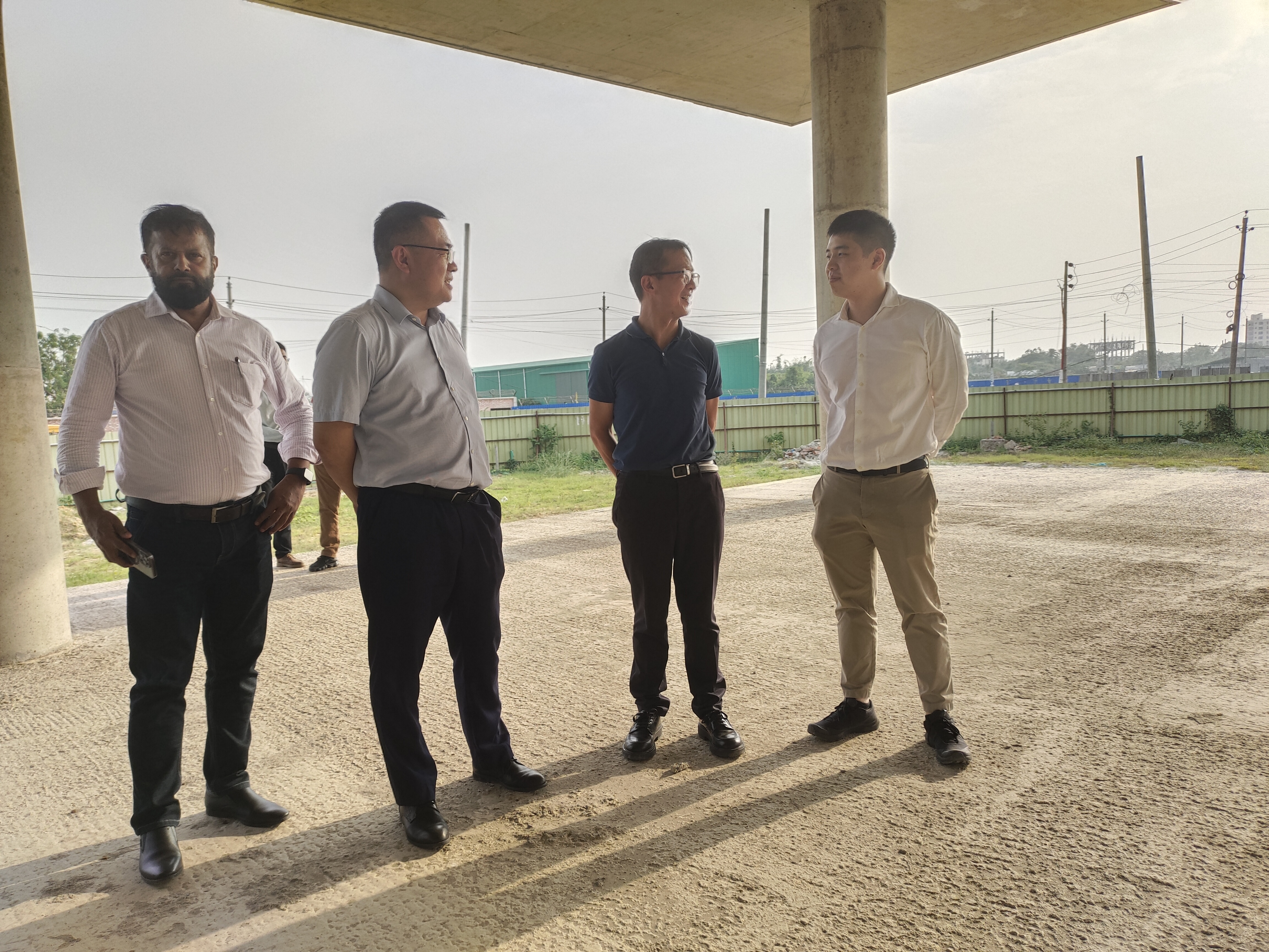 2024年4月23日,孟加拉國華人華僑聯合會終身榮譽主席、利德成集團董事局主席莊立峰一行到訪聯合水務集團孟加拉國普爾巴喬新城供水項目進行考察交流。 在聯合水務海外事業部總經理俞世晉、海外事業部副總經理兼孟加拉項目總經理戴大瑤等人的陪同下,考察組一行先后參觀了項目的施工現場、一期化驗室及客戶服務中心。在現場辦公樓前,戴總具體介紹了未來辦公樓集約利用與科學布局,并對項目一期的運營情況作簡要介紹。