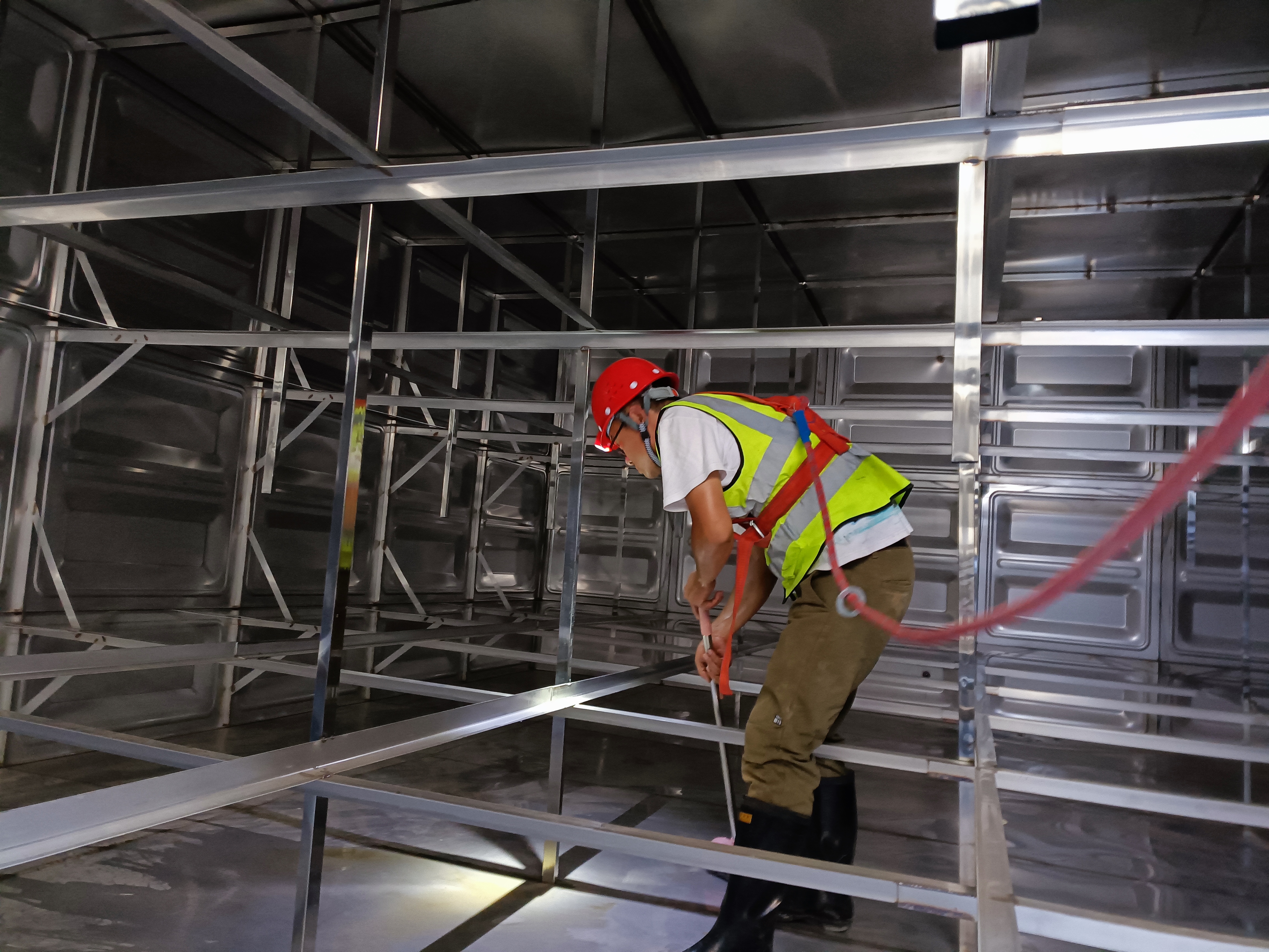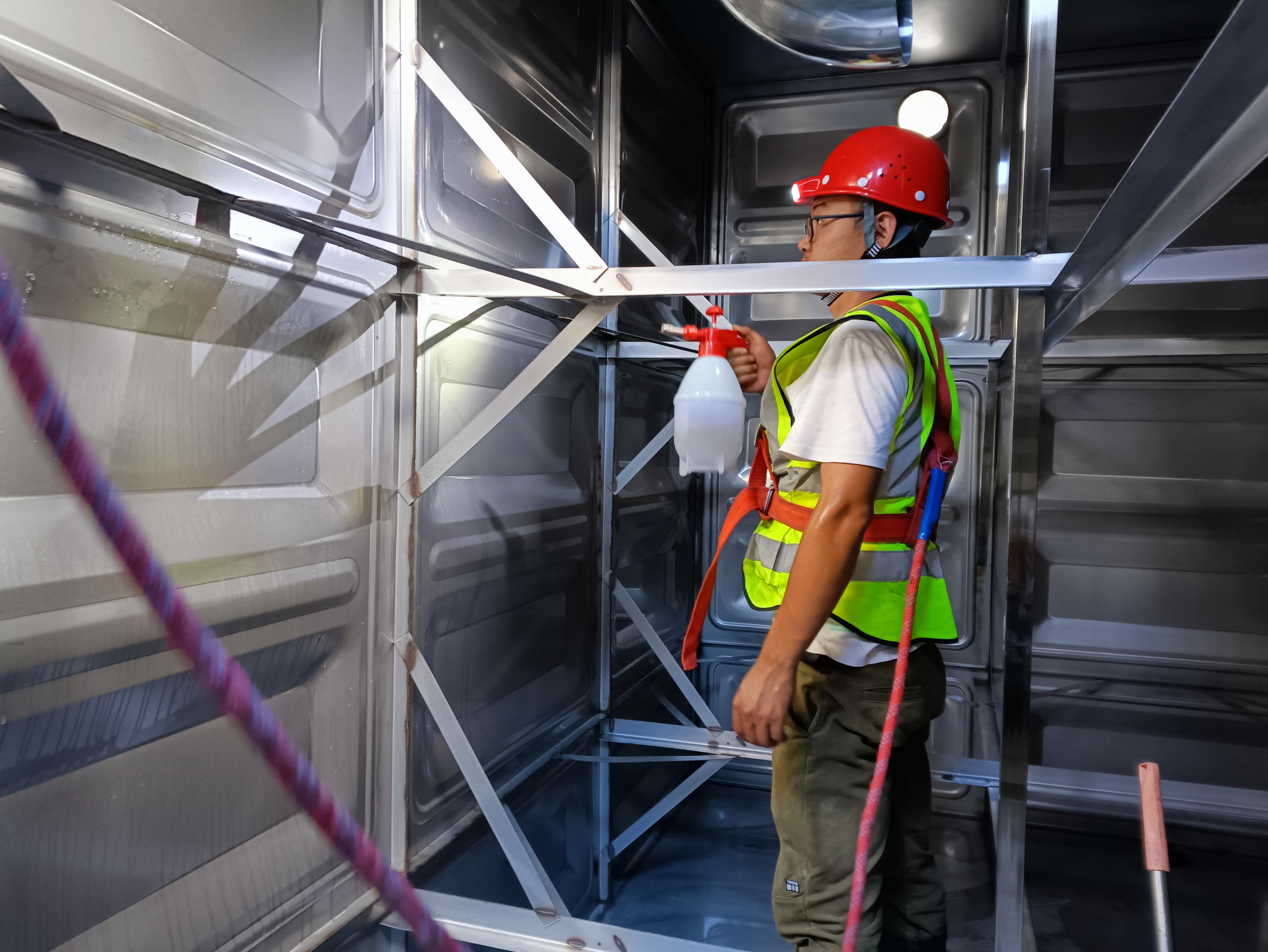 凌晨的夜,鄉(xiāng)村早已進(jìn)入了夢(mèng)鄉(xiāng),靜得出奇,但仍有一群不知疲倦的專業(yè)水務(wù)人,忙碌在洞口供水泵站內(nèi),不信,你瞧瞧這邊,專業(yè)電氣工程師雷軍,嚴(yán)格依照電氣設(shè)備維護(hù)保養(yǎng)規(guī)程,對(duì)泵房?jī)?nèi)的電機(jī)、控制柜、電源柜等設(shè)備逐一進(jìn)行全面檢測(cè)及維護(hù)保養(yǎng),確保電氣設(shè)備于良好的運(yùn)行工作狀態(tài);再看看專業(yè)機(jī)械工程師張黎,對(duì)泵房?jī)?nèi)的水泵、管道、閥門等設(shè)備的傳動(dòng)部位進(jìn)行潤(rùn)滑加油保養(yǎng)和除塵清潔,確保設(shè)備運(yùn)行無(wú)異響、無(wú)污染、無(wú)滴漏;你再探探水箱里面,專業(yè)的水箱清洗消毒員翁靜,一絲不茍的按照水箱清洗消毒操作標(biāo)準(zhǔn)流程:停水排污→水箱內(nèi)氣體檢測(cè)→送風(fēng)通風(fēng)→水箱內(nèi)氣體再檢測(cè)→第一遍沖洗及排污→水箱內(nèi)氣體再檢測(cè)→第一遍噴灑消毒→水箱內(nèi)氣體再檢測(cè)→第二遍沖洗及排污→第二遍噴灑消毒→水箱內(nèi)氣體再檢測(cè)→第三遍沖洗及排污→水質(zhì)濁度現(xiàn)場(chǎng)檢測(cè)→水質(zhì)取樣→送第三方機(jī)構(gòu)實(shí)驗(yàn)室檢測(cè);各司其職,忙而不亂,在大家共同協(xié)作完成后,泵房?jī)?nèi)設(shè)備煥然一新,準(zhǔn)時(shí)恢復(fù)供水,大家摸摸臉上的汗珠,露出了開(kāi)心的笑容。