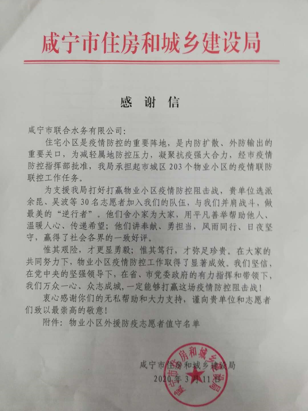 [ 聯(lián)合水務(wù)搶修人員堅(jiān)守一線 ] 志愿擔(dān)當(dāng),服務(wù)社區(qū),為共同抗疫出份力。 時(shí)有所需,必有所為。聯(lián)合水務(wù)集團(tuán)勇?lián)鐣?huì)責(zé)任,以主人翁意識(shí)服務(wù)地方抗疫工作。宿遷銀控自來(lái)水有限公司對(duì)接陸河小區(qū)等社區(qū)服務(wù)站,協(xié)助值守。志愿者在值班小區(qū)每天堅(jiān)持工作13個(gè)小時(shí),用熱血抒寫(xiě)著擔(dān)當(dāng),充分彰顯了聯(lián)合水務(wù)人的愛(ài)心善意和責(zé)任擔(dān)當(dāng)。咸寧聯(lián)合水務(wù)有限公司在保障城區(qū)正常供水情況下,公司黨組織還發(fā)揮黨員、團(tuán)員帶頭作用, 30余名青年員工組成了一支支志愿者服務(wù)隊(duì),奔赴城區(qū)21個(gè)物業(yè)小區(qū),協(xié)助小區(qū)物業(yè)開(kāi)展疫情防控工作。3月11日,咸寧聯(lián)合水務(wù)有限公司收到一封來(lái)自咸寧市住建局的感謝信,信中對(duì)咸寧聯(lián)合水務(wù)志愿者們無(wú)私的奉獻(xiàn),表示高度肯定和崇高的敬意。