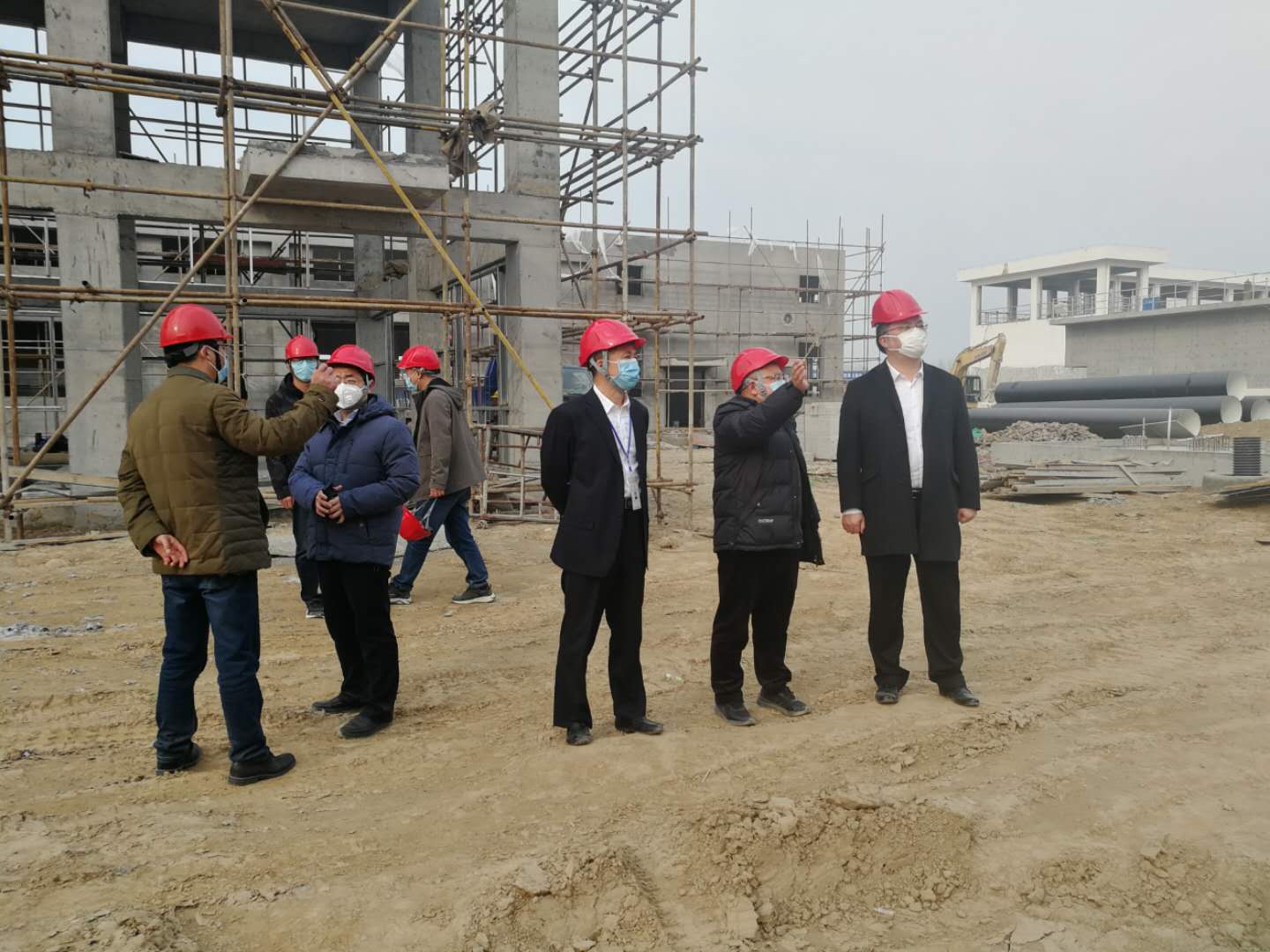 在二水廠四期擴建工地現場,宿遷公司項目部經理王冬青向劉總詳細匯報項目進展情況:目前項目復工后各項工作有序開展,土建主體施工已基本完成,化驗值班樓正在加緊施工;工藝管道安裝正在緊張施工,工藝設備陸續到貨,整體的安裝工程已完成約50%,廠區工藝管線完成約10%;高壓配電安裝正在施工。