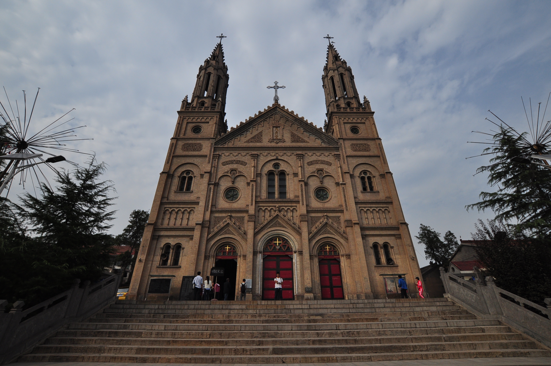 圖1:教堂外景 新絳天主教堂位于新絳縣的一座大型天主教堂,天主教新絳(運城)教區的主教座堂,位于新絳縣城北街頂端的高崖上。新絳是山西省最早傳入天主教的地方,1620年(明朝萬歷四十八年),意大利神甫艾儒略來到絳州,建立山西省第一座天主教堂。1935年,梵蒂岡教廷宣布成立新絳教區,是天主教在山西的8個教區之一,管轄附近22個縣的天主教堂。1937年,荷蘭神父孔昭明在此建造了一座哥特式建筑風格的大型主教座堂,于1943年落成。其建筑規模在全中國的哥特式教堂中屬于較大的一座,與青島、上海、廣州教堂并稱全國四大天主教堂。