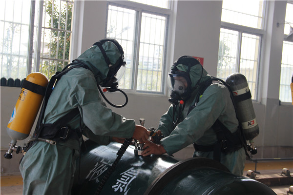 圖:氯氣泄漏演練現場 隨著一陣警鈴聲響起,液氯泄漏應急演練活動正式開始。水廠值班人員發現加氯間內有煙霧彌漫,在確定是氯氣泄漏后,水廠負責人立即向分管生產領導付總匯報,并拉好警戒線迅速疏散職工撤離到安全地帶。在付總的指示下,立即啟動《王英水廠氯氣泄漏預案》指令,搶修組成員在穿戴防化服和正壓式空氣呼吸器進入氯庫進行查漏處置,對泄漏儲罐進行泄壓、堵漏、倒罐,經過3分鐘左右的緊急有序搶修,氯氣泄漏事故得到妥善處理。