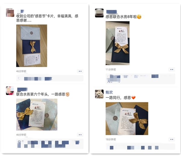 圖/ 員工朋友圈展示賀卡圖片 樹因有葉的陪伴而魏然,天因有云的守候而蒼茫,一群剛進入公司的應屆畢業生如同雛鷹,今雖被依偎于懷中,但終有一日會展翅翱翔。于是,昔日的恩情終被銘記!集團管培生項目正如火如荼地開展,一份份鴻雁傳書,于字里行間表達了對公司的無盡謝意,匯成了感恩節活動的一道亮麗風景。且聽他們的心聲:“感謝聯合水務公司的全體同事平時對我們的照顧,你們的每一份友好鼓勵、每一個善意的微笑、每一次細心的指導都讓我們感動萬分,你們的關愛讓我們融入到這個溫馨充滿和諧的大家庭里。三個月的學習與接觸,讓我們感受到了聯合水務這個大家庭內在的魅力,讓我們為自己有幸來到聯合水務公司工作而感到自豪。”一份知遇,一路同行,一生相守。 在愛意流淌間,讓我們為這次感恩節系列活動畫上一個圓滿的句號。感恩員工,為公司發展全力以赴;感恩公司,給我們一個廣闊的平臺;感恩領導,對我們的殷殷教導;感恩同事,對我們的支持幫助。公司感恩員工,員工亦感恩公司,以這份相攜相守的情意一路同行,風雨與共,共創新輝煌! 心系聯合水務,感恩與你同行! |