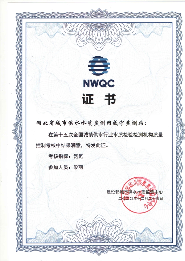 為加強(qiáng)城鎮(zhèn)供水水質(zhì)檢驗檢測機(jī)構(gòu)的質(zhì)量控制,促進(jìn)檢測能力和管理水平提升,住建部城市供水水質(zhì)監(jiān)測中心于2020年組織開展《第15次全國城鎮(zhèn)供水行業(yè)檢驗檢測機(jī)構(gòu)生活飲用水氨氮項目的質(zhì)量控制考核》,香泉水檢公司暨湖北省城市供水水質(zhì)監(jiān)測網(wǎng)咸寧監(jiān)測站報名參加了本次能力驗證活動。2020年9月2日,公司順利完成了氨氮能力驗證考核樣品檢測。近日,公司接到了住建部頒發(fā)的能力驗證結(jié)果通知書,順利通過本次水中氨氮項目的能力驗證,取得了“滿意”結(jié)果。