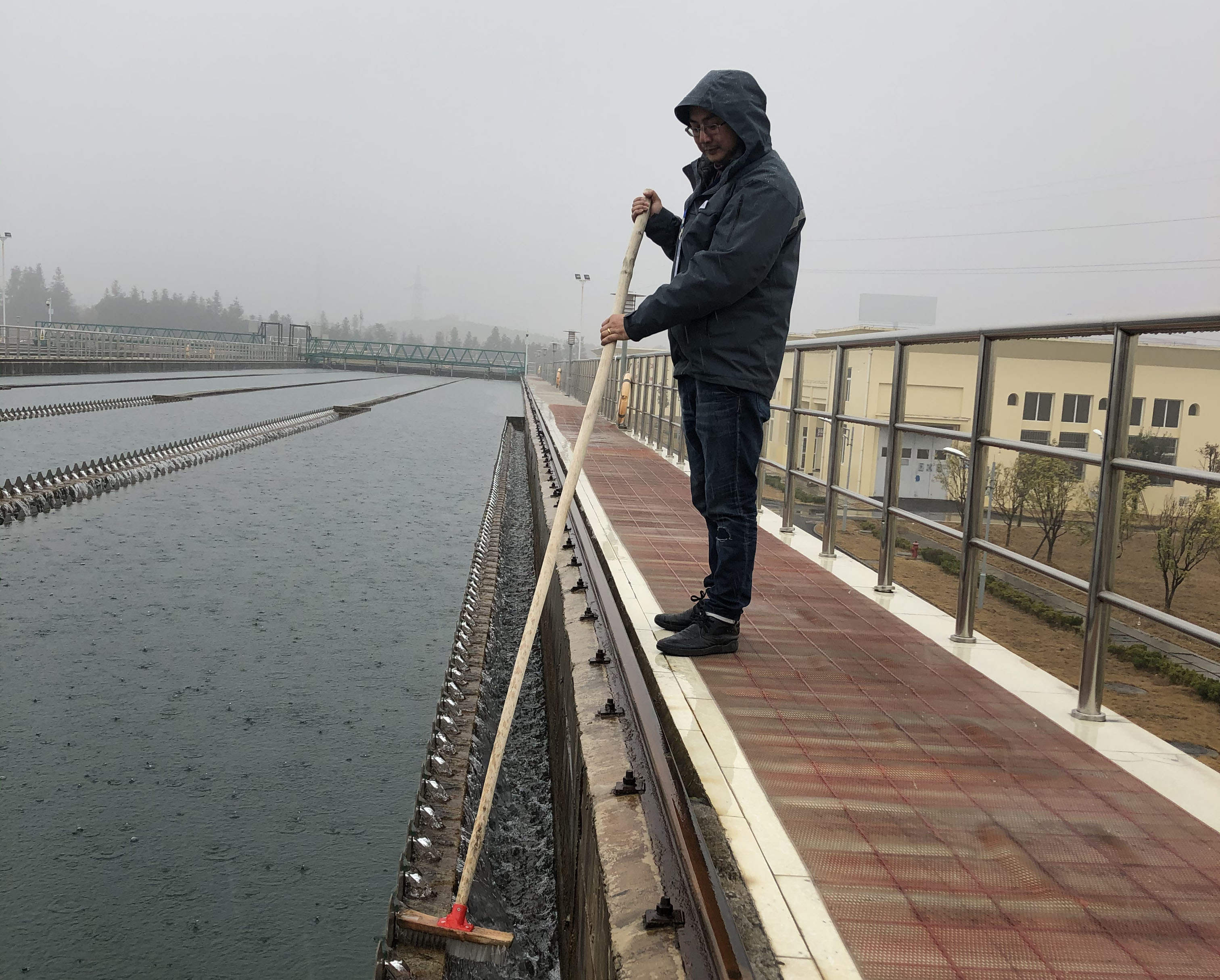 圖:陳鋒在平流沉淀池上冒雨工作 與此同時,我們的客服部門也是全天無休,24小時在班值守,客服工作人員兩班輪班,保障供水服務熱線24小時接聽無阻。