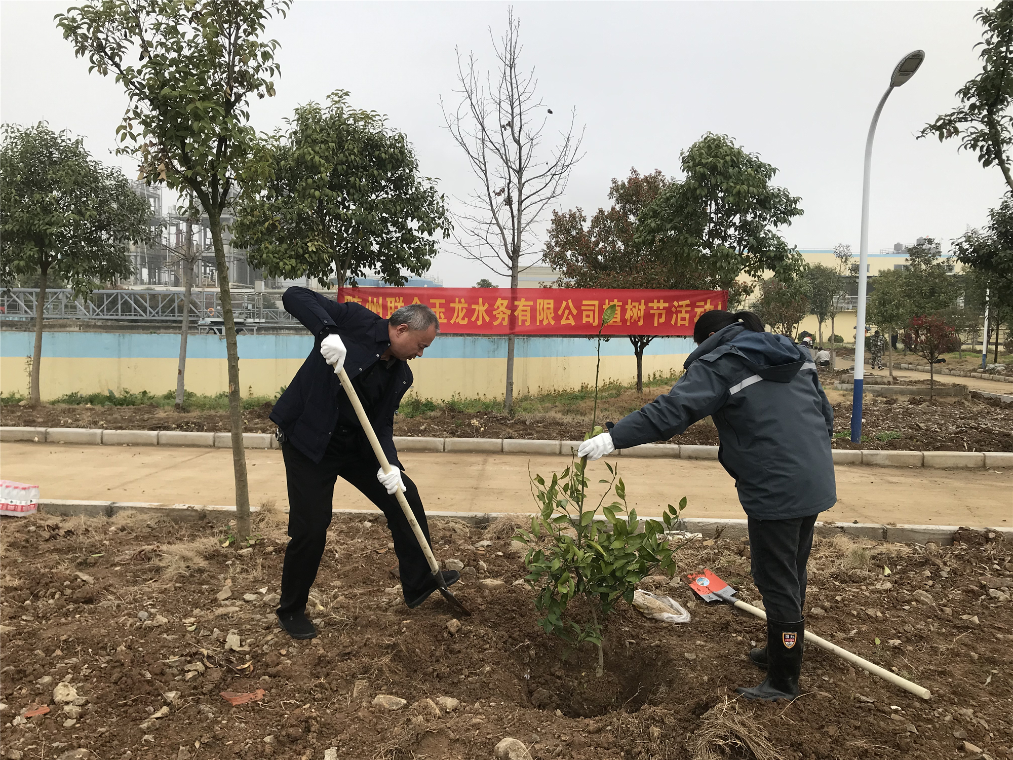 鄭總率領姚行兵總、朱曉成總等領導先于員工到達二期二沉池的活動集合地點,只見“隨州聯合玉龍水務有限公司植樹節活動”字樣的大紅橫幅在兩棵去年栽下的樟樹間隨風舞動,明黃色大字在春日照耀下熠熠生輝。人員全部匯集后,鄭總首先對我們闡明了植樹的意義,鄭總說:我們公司就用實際行動一直踐行著這一理念,發揚植樹、愛樹、護樹的優良傳統。這對于我們隨州聯合玉龍公司這樣一個從事環保偉大事業的企業來說,意義更加重大!
