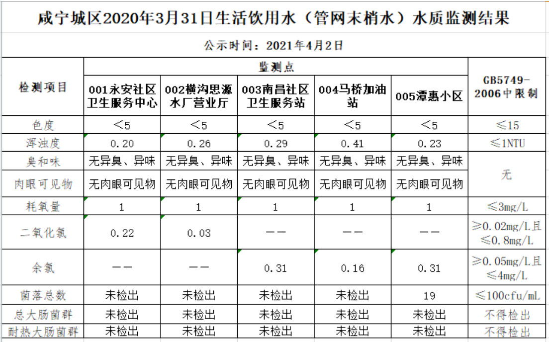 圖:市衛健委公示管網末梢水監測結果 除了省城市供水水質監測網的季度抽查,咸寧市衛計委、市住建局和市生態環境局,分別作為市級主管部門對咸寧聯合水務供水水質進行月檢、半月檢及日檢。市疾控中心每月對水源水、出廠水水質進行常規42項檢測,每天對管網末梢水水質進行7項指標監測,其結果在咸寧市衛計委網站公開發布;市住建局每半年對各出廠水水質進行常規42項督查;市生態環境局對各水廠飲用水水源水質進行實時在線監測。