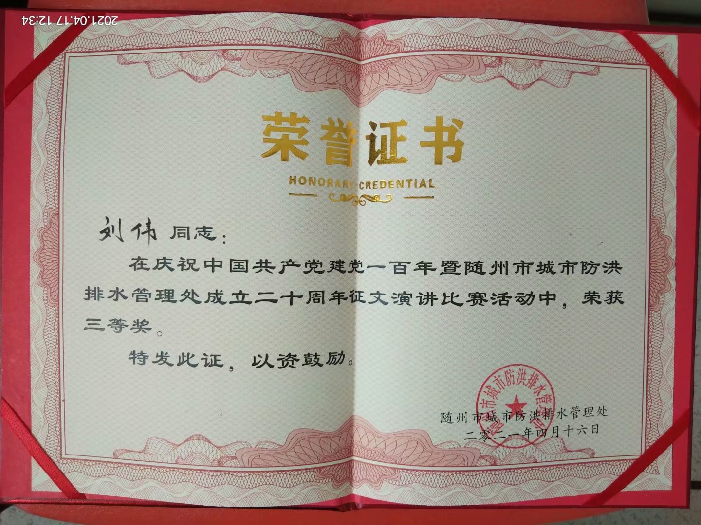 劉偉榮獲演講三等獎 經過近兩個小時的比賽和評比,羅姚獲得了第二名優異的成績,劉偉獲得了第三名的好成績。 隨州聯合水務積極參加隨州市住房和城鄉建設局和隨州市城市防洪排水管理處等上級主管部門組織的各類活動,都取得不錯的成績。兩位選手以聲情并茂的演講,充分展示了聯合水務人銳意進取、務實擔當的良好精神風貌,為公司贏得榮譽的同時,自身能力也得到了展示。 |