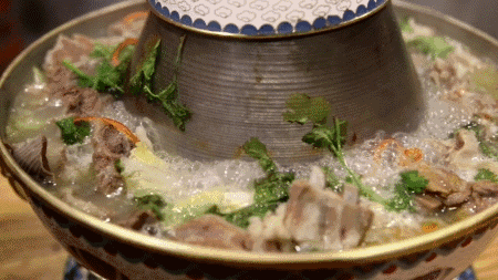 圖:絳州銅火鍋 銅火鍋做法 絳州銅火鍋看似簡單,卻不僅僅是鋪幾層菜,添上湯那么簡單,底湯怎么熬,菜品怎么放,都十分講究。 新絳要說銅火鍋哪家好,當屬合勝火鍋。絳州合勝火鍋沿襲了傳統的火鍋工藝,但其老板韓合勝和老板娘李春英又根據當地群眾的飲食習慣,進行了科學的配料和烹調,以“肉多、價低、湯鮮美”聲名遠揚。 做銅火鍋的關鍵之處是湯汁,俗話說“火鍋好不好,嘗湯就知道”,說的就是這個理。 合勝火鍋光是熬制底湯就需5小時~6小時,里面有整只雞、豬大骨、豬肉,再配以草果、香葉、桂皮、小茴香等20多種香辛料,一直大火熬制。然后就是配湯,醬油、鹽、味精、調料粉放多少,也得稱量,只為保證味道的純正。用料實在、工序復雜,這也是為什么新絳銅火鍋湯好喝的原因之一。此外,湯汁經過與肉、菜同煮,除了原湯的濃郁,還有了菜的清香與肉的鮮美,味道更豐富,口感更佳,尤其在秋冬季,吃完火鍋后,再喝上一口湯,全身都開始變得暖和起來。