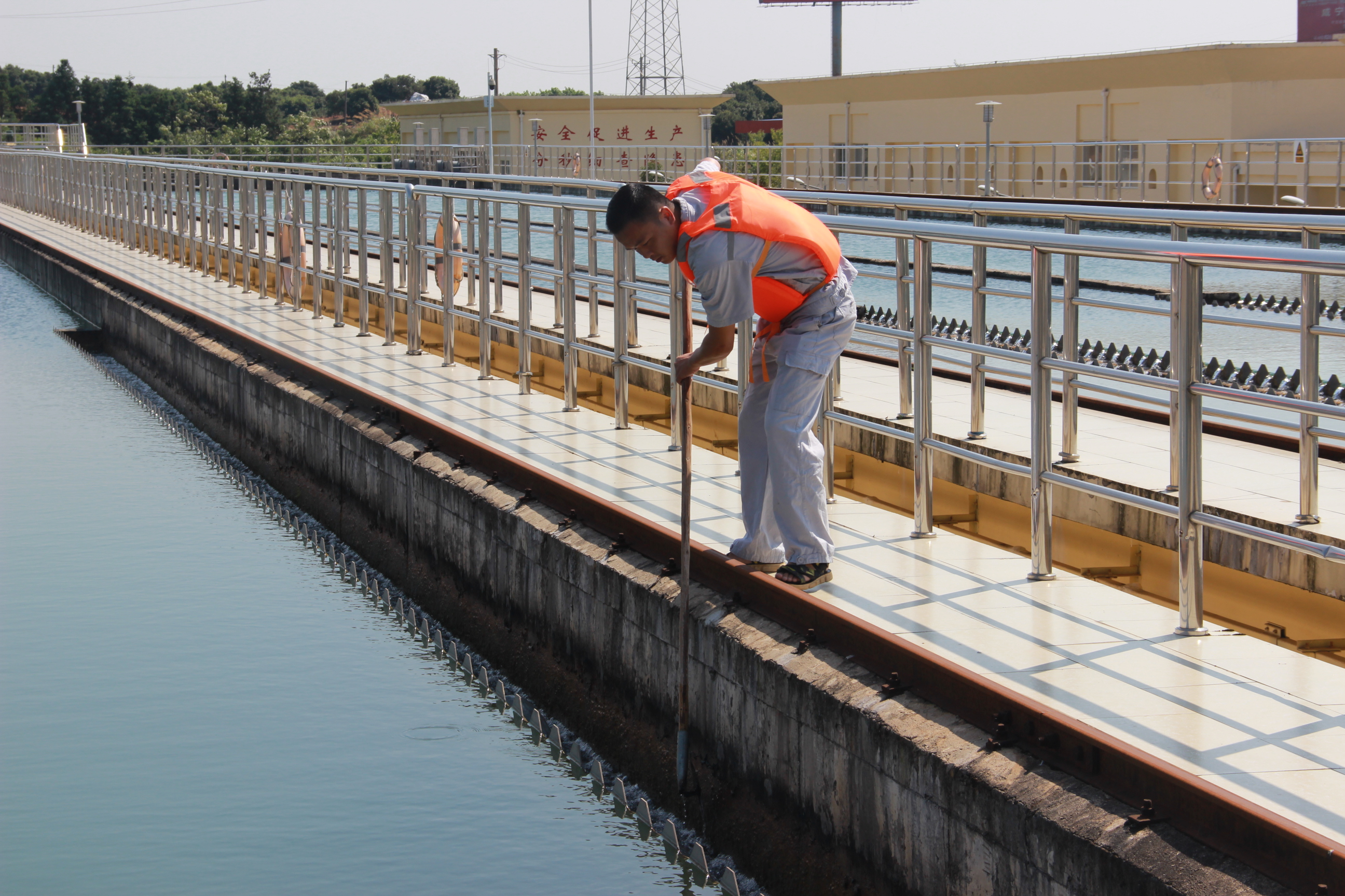 圖:柯偉進行清苔工作 夏季是用水高峰期,為保障城區供水無礙,水廠的泵站早已進入超負荷運轉模式。確保供水機組正常運轉是夏季保供水工作中最關鍵的環節,因此每隔兩小時就需對供水機組設備進行巡視檢查,全天24小時無休。走進泵站,感覺仿佛置身于蒸拿房一般。雖然在室內,但由于機組大設備散發出的龐大熱量,即使有排風扇等設施散溫,但泵站內的溫度仍然比室外高出一截。此時,陳鋒正在進行日常巡檢工作,決然不懼泵站內的高溫,仔細的巡查著每一臺設備。