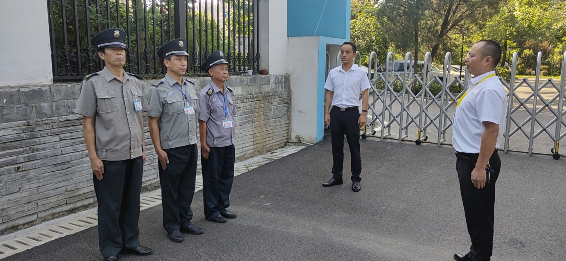 第二環節是由興安保安公司對所有保安開展專業技能實際操作培訓。實操培訓分為兩步:首先是對所有駐聯合水務執勤班保安隊員開展著裝、隊列培訓學習;最后是保安隊員的專業技能培訓,培訓結束后,要求每一位保安隊員都著裝正確,隊列動作整齊,能現場熟練演練保安八件套和各項消防器材法。不能達到以上培訓目標的人員優勝劣汰,離崗處理。