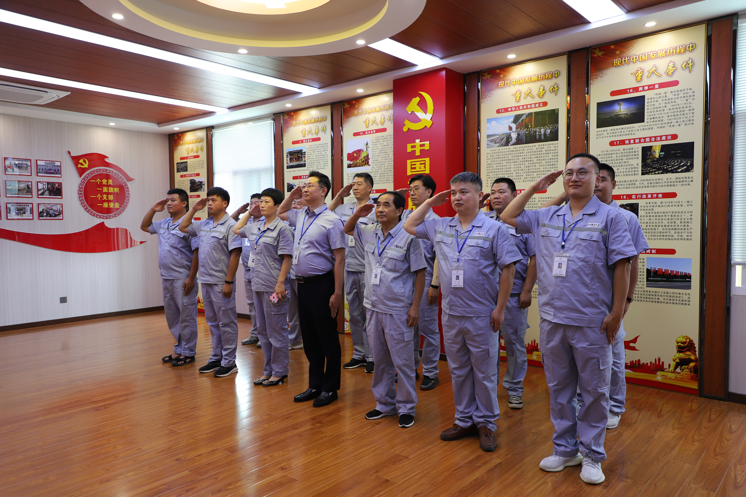圖:座談會現場 座談會結束,大家來到辦公樓三樓,參觀公司新建成的黨員活動室,處處洋溢著的黨性光輝讓大家激情滿懷,對著黨旗行軍禮,莊重肅穆,再展軍人風姿。