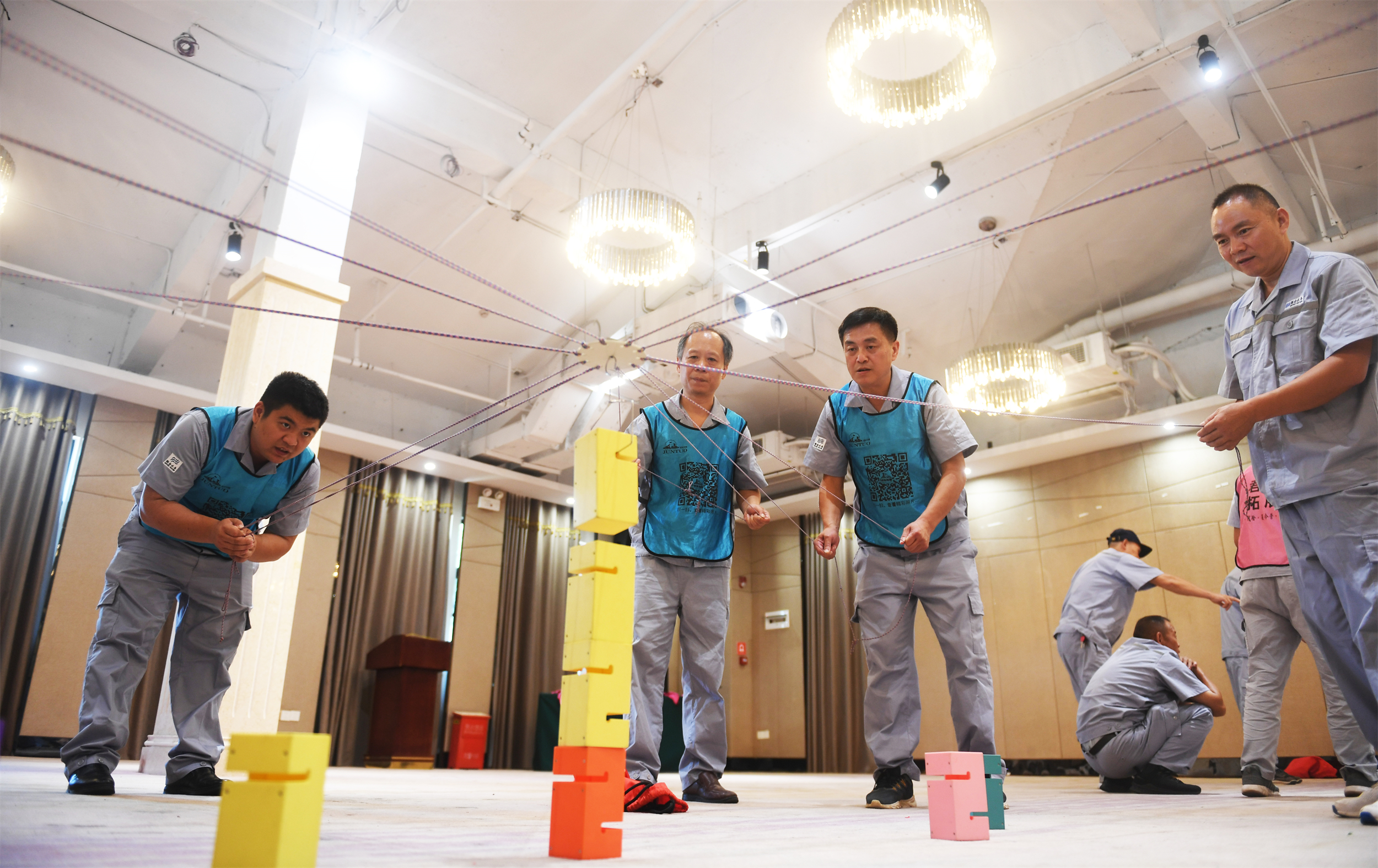 重溫軍旅情懷,回憶崢嶸歲月。團建活動由一場熱身活動開始,隨著教練的一聲令下,大家紛紛以標準的軍姿站立,英姿颯爽讓人肅然起敬。團建活動共由“ 挑戰150”、“合力建塔”和“環游世界球”三個環節組成,看似簡單的三個環節,既考驗著團隊的合作協助,又考驗著個人意志。在活動中,大家為了完成任務而拼搏,即使遇到困難也不言棄。“老兵隊”在“合力建塔”環節因最后一塊塔片未完美搭建而導致整座塔倒塌,但在隊長的帶領下,他們互相加油打氣,重新從第一塊塔片開始搭建,最終一鼓作氣完成了任務。