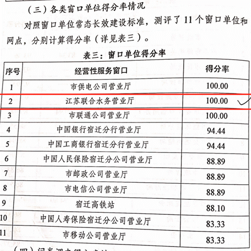 為全面評(píng)估今年以來市區(qū)文明城市長(zhǎng)效建設(shè)有效成果,宿遷市長(zhǎng)效辦根據(jù)年度工作安排,對(duì)照2021年版《全國文明城市(地級(jí)以上)測(cè)評(píng)體系》,委托第三方調(diào)查機(jī)構(gòu)開展了上半年市區(qū)文明城市長(zhǎng)效建設(shè)指數(shù)測(cè)評(píng)。在此次測(cè)評(píng)中,江蘇聯(lián)合水務(wù)科技股份有限公司宿遷公司營業(yè)廳榮獲經(jīng)營性服務(wù)窗口100分,排名第一。