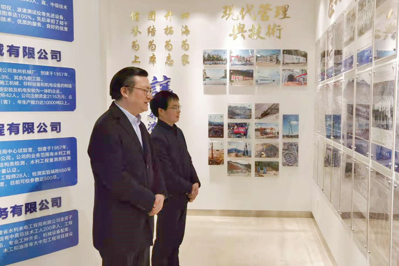 會前,劉總一行在福建省水利水電工程局有限公司總經理助理楊世杰及經營部經理馬碧山的陪同下,參觀了福建水利建設成就展覽館,馬經理向劉總詳細介紹了福建水利一路走來的發展歷程以及取得的相關成就,劉總對合作單位取得的成就由衷祝賀,并表示對今后聯合水務和福建水利強強聯合充滿期待。