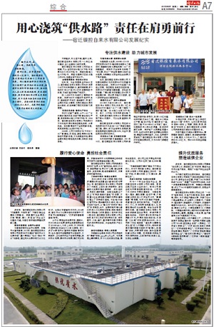 建市以來,在市委市政府的關(guān)心支持下,宿遷銀控自來水有限公司歷經(jīng)十二年改革發(fā)展,用心編織城市供水安全網(wǎng),有力保障了我市供水安全優(yōu)質(zhì)。值建市20周年即將來臨之際,宿遷供水人在以更飽滿的熱情、更優(yōu)質(zhì)的服務(wù),投身到宿遷供水事業(yè)發(fā)展的同時(shí),更不忘肩頭擔(dān)負(fù)的社會責(zé)任,奮力前行,在宿遷投資供水設(shè)施近8億元人民幣,為我市的高速發(fā)展做出新的更大的貢獻(xiàn)。