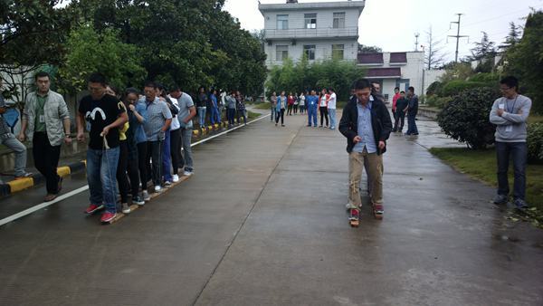 9月30日下午,舉辦的是“無(wú)軌列車”活動(dòng)。該項(xiàng)團(tuán)體活動(dòng)要求每組4男4女搭配,各組組員的兩腳必須分站在由兩塊木板制成的行走板上,協(xié)調(diào)一致前行,在比賽過(guò)程中任意隊(duì)員任意部位與地面有接觸,即被警告1次,同時(shí)在總成績(jī)上增加10秒,警告3次取消比賽資格。賽道全長(zhǎng)50米,含下坡路段,成績(jī)匯總后,以完成比賽用時(shí)最短的一組獲勝。最終,行政財(cái)務(wù)聯(lián)隊(duì)以1分48秒的成績(jī)獲得第一,工程聯(lián)隊(duì)獲得第二,洋河聯(lián)隊(duì)、污水客服聯(lián)隊(duì)并列第三。