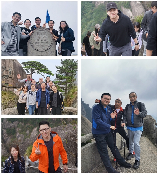 品味書香,傳遞溫情 到達目的地已是夜幕降臨,團建的第一項,就是為近期過生日的同事舉辦生日晚宴。 圖:生日晚會掠影 晚餐進行過半,“生日快樂”的歌聲驟然響起,餐廳里的氣氛瞬間活躍起來。生日會上,壽星們在大家祝福的掌聲中收獲了俞總親自贈予的書籍。展卷有益,享受閱讀,快樂生活,這也是集團選擇贈書的寓意所在。這場在黃山下豐樂湖畔舉辦的生日宴會,也讓壽星們在團隊中感受暖暖的人文關懷。 同心協力,勇攀高峰 以奇松、怪石、云海、溫泉“四絕”著稱的黃山,是大自然造化中的奇跡,被世人譽為“天下第一奇山”。明代大旅行家徐霞客曾兩次登臨黃山,嘆道:“薄海內外無如徽之黃山,登黃山天下無山,觀止矣!”后人據此概括為“五岳歸來不看山,黃山歸來不看岳”。黃山千米以上高峰72座,“蓮花”、“光明頂”、“天都”三大主峰的海拔均逾1800米。此次團建需要挑戰的主峰則是位于黃山中部的光明頂和蓮花峰。 圖:團隊在黃山風景區合影留念 9月26日,40余人的團隊跟隨著飄揚的聯合水務旗幟,激情滿滿地前往黃山風景區。黃山山間接近四萬級石階古道,遠遠望其,延綿不絕,正是考驗耐力和意志力的時刻。隨著山峰越來越陡峭,輕快的步伐也越發沉重。隊員三三兩兩組成小團隊,相互扶持,相互鼓舞,歷經幾個小時的攀爬,聯合水務的旗幟終于飄揚在1860米高的光明頂上。登山途中,大家也不忘欣賞沿途的風景,始信峰、飛來石、百步云梯、鰲魚洞、蓮花峰、迎客松……每一個景點都讓人流連忘返,驚嘆大自然的鬼斧神工。大家將沿途美麗的風景收在鏡頭里,印在腦海中,留作紀念。 圖:攀登黃山精彩瞬間 “青磚黛瓦馬頭墻,回廊掛落花格窗。”當晚,團隊來到被譽為“流動的清明上河圖”的屯溪老街,品嘗地道的徽派美食。晚宴上,俞總對團隊在黃山上的表現給予高度贊揚。出于每個人身體素質不同,起初制定了長(難)、短(易)兩條登山路線。為了集體參與感和榮譽感,選擇短(易)路線的隊員今日全部選擇長(難)路線登頂,他們“克服困難,勇攀高峰”的表現也得到了俞總和其他隊員鼓舞和欽佩的掌聲。